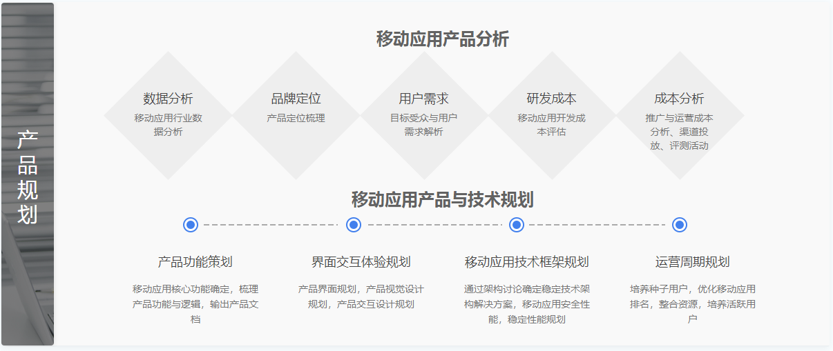 为企业升级转型提供 APP 的定制化服务,包括APP产品调研、需求分析、UE、UI设计、开发、测试、部署上线等一系列解决方案